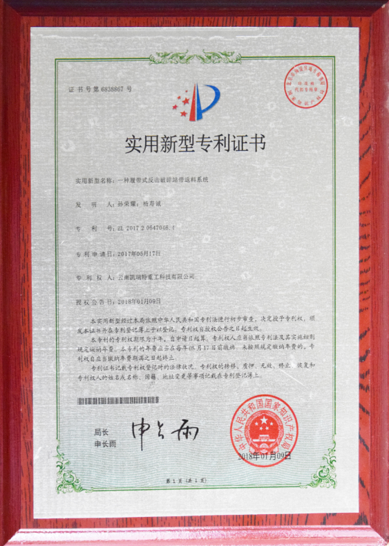 專利證書【履帶式反擊破碎站帶返料系統(tǒng)】