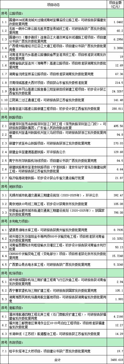 據(jù)統(tǒng)計(jì),3月份國家及省市級(jí)發(fā)改委、交通運(yùn)輸廳共批復(fù)了約 33 項(xiàng)重大工程項(xiàng)目的可行性研究報(bào)告、初步設(shè)計(jì)、項(xiàng)目核準(zhǔn)建議書以及環(huán)評(píng)公示等,總的項(xiàng)目投資額近 3500 億元。包含約 831 億的公路項(xiàng)目,1103 億的鐵路項(xiàng)目,1295 億的城軌交通項(xiàng)目,90 億的水利電力項(xiàng)目,110 億機(jī)場項(xiàng)目,以及約 50 億的港航、市政工程。加上1-2月份,本年度一季度已經(jīng)發(fā)布了約有 7815 億元的項(xiàng)目動(dòng)態(tài)。