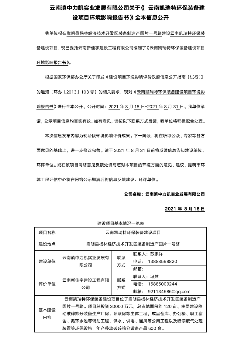 云南滇中力凱實業(yè)發(fā)展有限公司關(guān)于《 云南凱瑞特環(huán)保裝備建設(shè)項目環(huán)