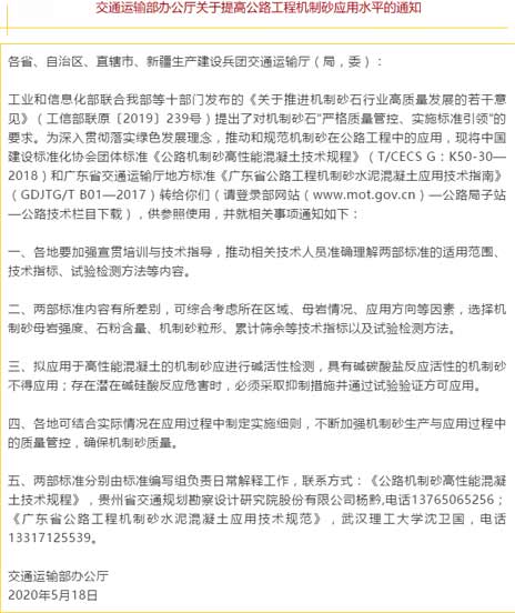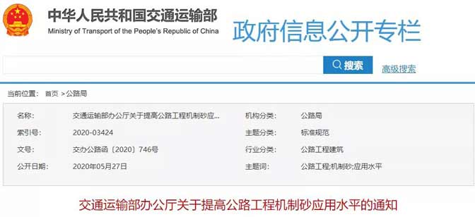 近日機(jī)制砂行業(yè)迎來新曙光,為解決中國河砂緊缺的局面,2020 年5月27日交通運(yùn)輸部發(fā)布《交通運(yùn)輸部辦公廳關(guān)于提高公路工程機(jī)制砂應(yīng)用水平的通知》,力推機(jī)制砂應(yīng)用于全國公路工程應(yīng)用!并對對機(jī)制砂石質(zhì)量給出具體參考標(biāo)準(zhǔn),各地可結(jié)合實(shí)際情況在應(yīng)用過程中制定實(shí)施細(xì)則,不斷加強(qiáng)機(jī)制砂生產(chǎn)與應(yīng)用過程中的質(zhì)量管控,確保機(jī)制砂質(zhì)量。