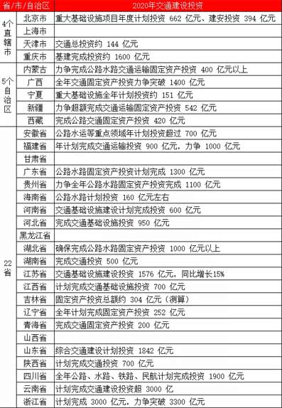 而隨著全國 31 個(gè)省市自治區(qū)(不含港澳臺)的政府工作報(bào)告和交通運(yùn)輸會議的公布及召開,2020 年我國各個(gè)地區(qū)的交通建設(shè)目標(biāo)也隨之明確。